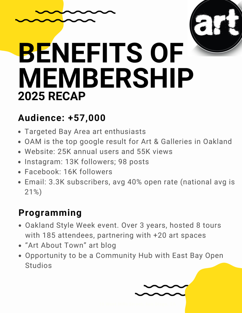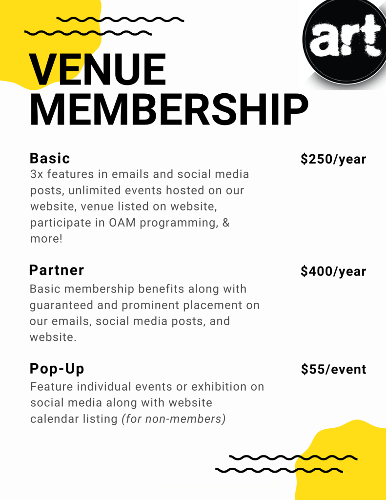 - Your events and exhibitions highlighted a minimum of 3 times per year on OAM’s newsletters and weekly social media postings to over +30k visual arts enthusiasts.