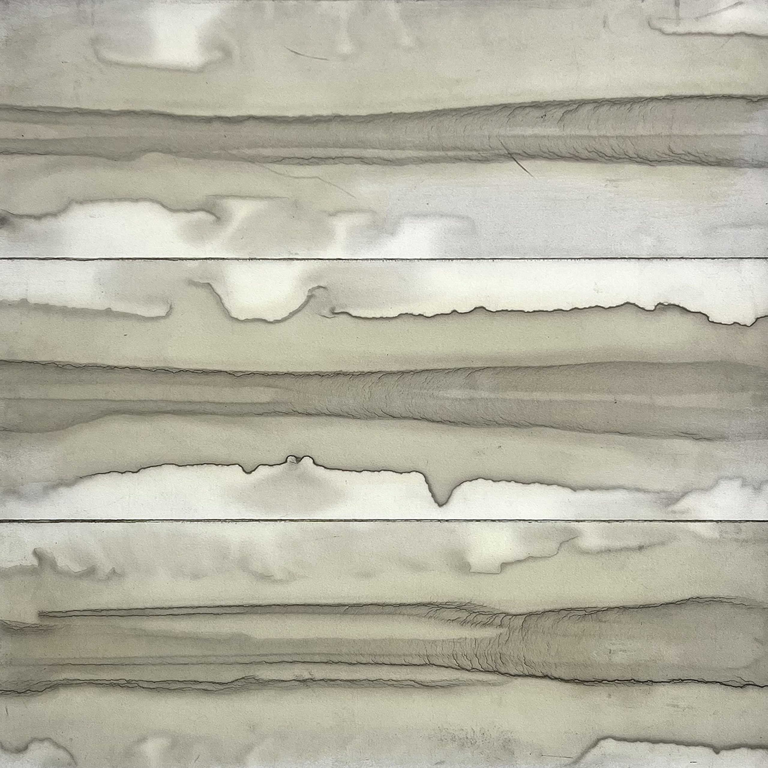 Twenty-five years ago, in the shadow of the September 11 attacks, Charlie Milgrim searched for a way to confront the deeper forces fueling global conflict. She turned to the very substance that was a catalyst in those struggles: oil. With a bowling ball as her brush, she rolled long lines across thick paper with used motor oil, setting the “landscapes” in motion. Over the decades, the contaminants in the motor oil slowly seeped outwards, its unpredictable spread mirroring the drifting, uncontrollable nature of an oil spill. Time became an important collaborator in the piece, shaping its quiet but constant transformation.