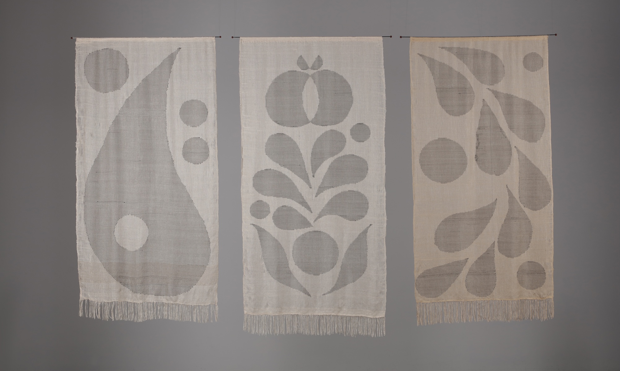 Using silk thread and simple motifs, Christine Meuris has created a series of semi-transparent weavings that reflect feelings of harmony, joy, flow, and wholeness.