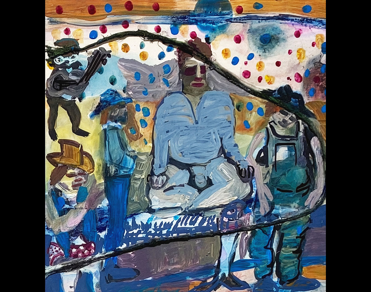 Image: KC Rosenberg, “Men Named Merle,” 2025 from Raised By Wolves series, 2026, Acrylic paint and yarn on wood panel, 8″ x 8″, photo courtesy of the artist